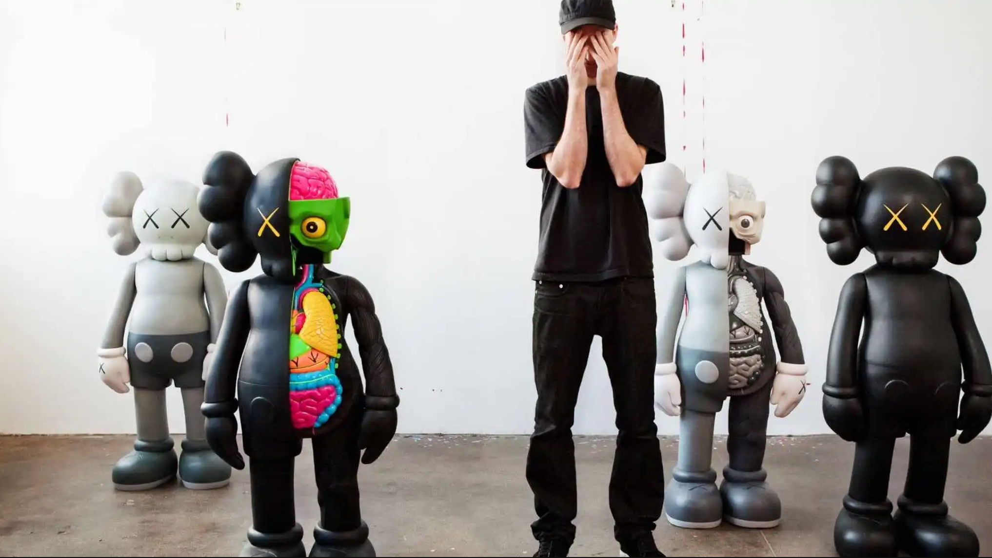 Dopo aver studiato alla School of Visual Arts di New York, KAWS ha lavorato come illustratore per Disney, affinando il suo tratto grafico. Negli anni 2000, ha iniziato a produrre sculture e giocattoli da collezione, collaborando con aziende giapponesi come Medicom Toy. Il suo personaggio più iconico, Companion, è una figura ispirata ai cartoni animati, con occhi a "X" e un’espressione malinconica, diventata simbolo del suo universo artistico.
